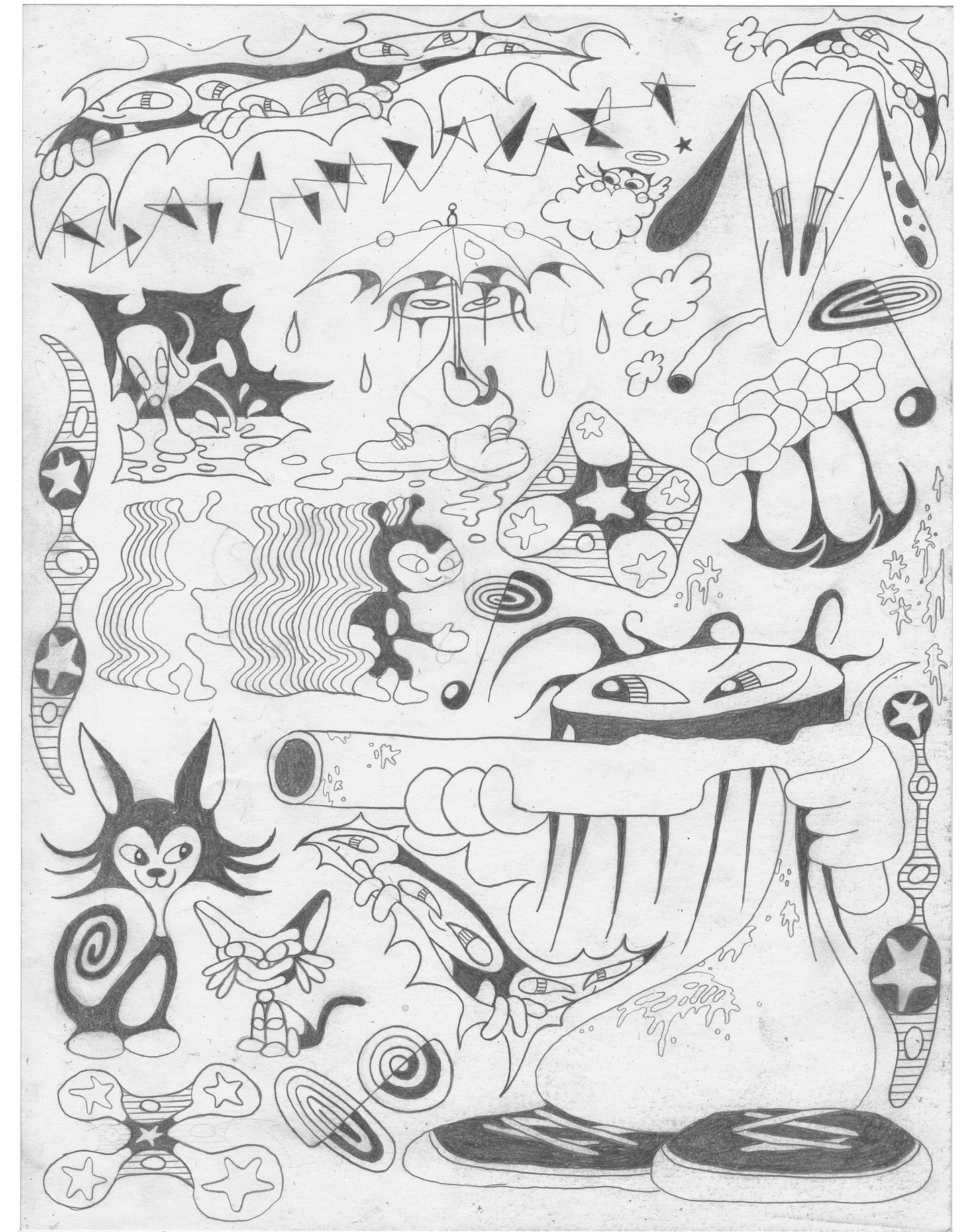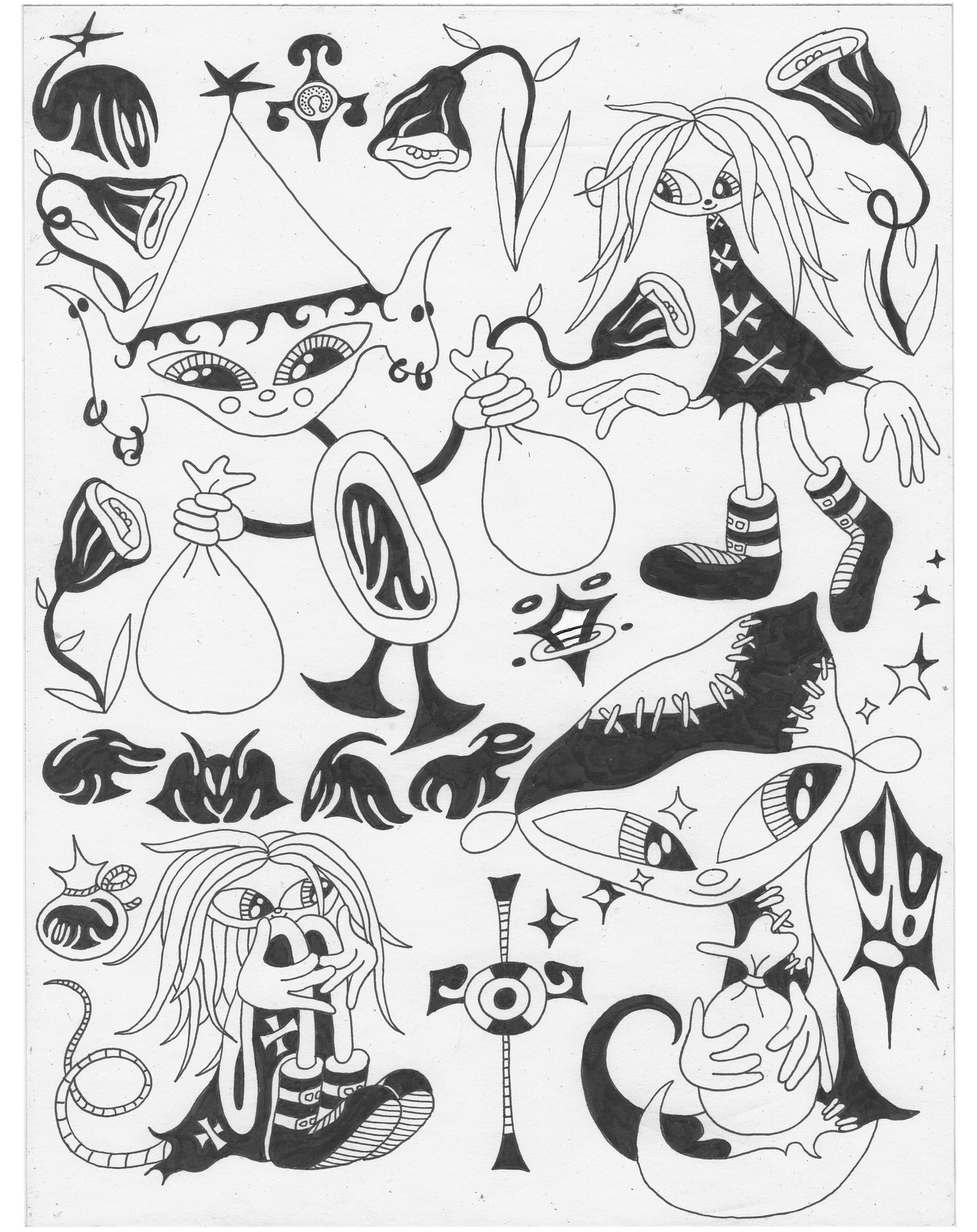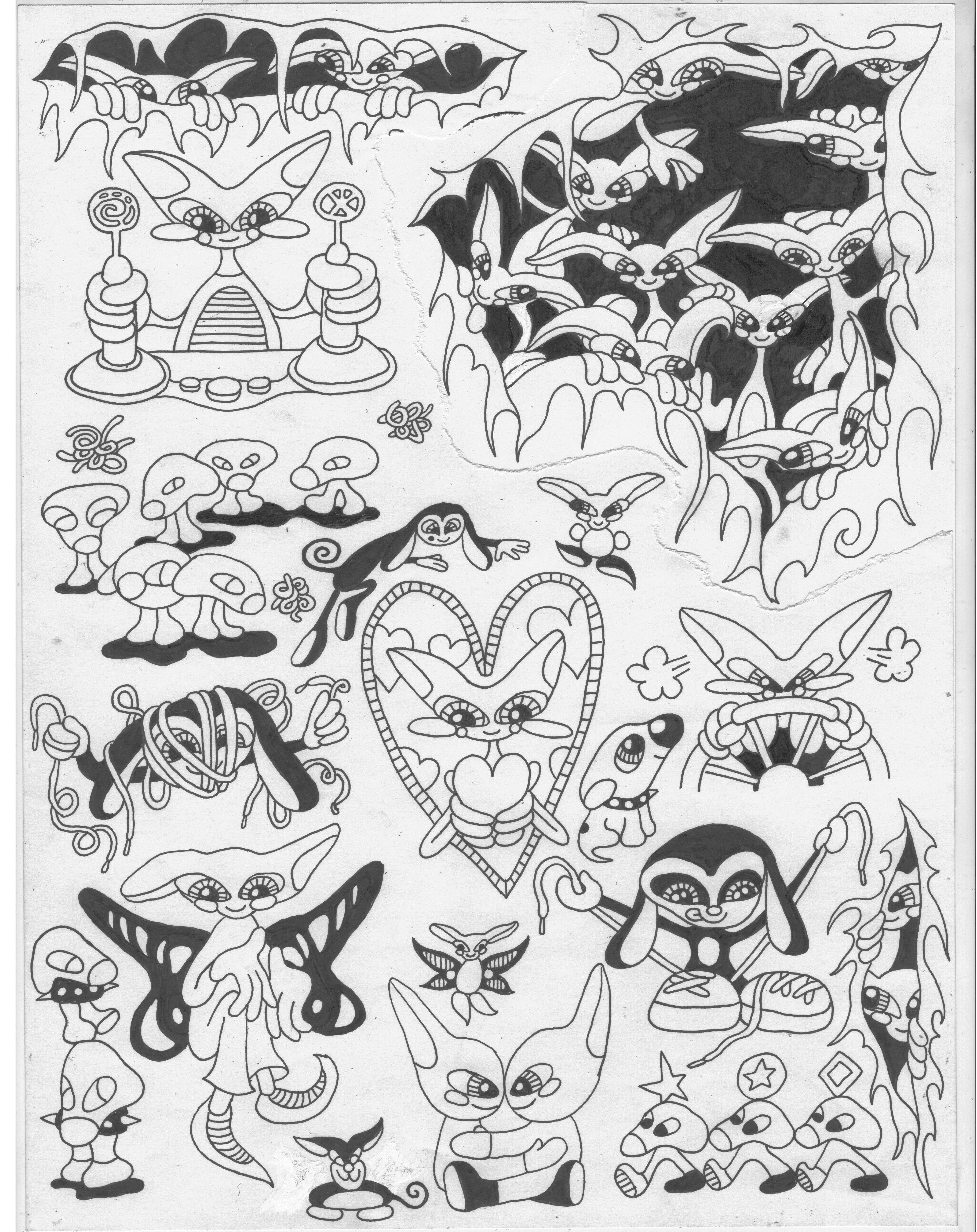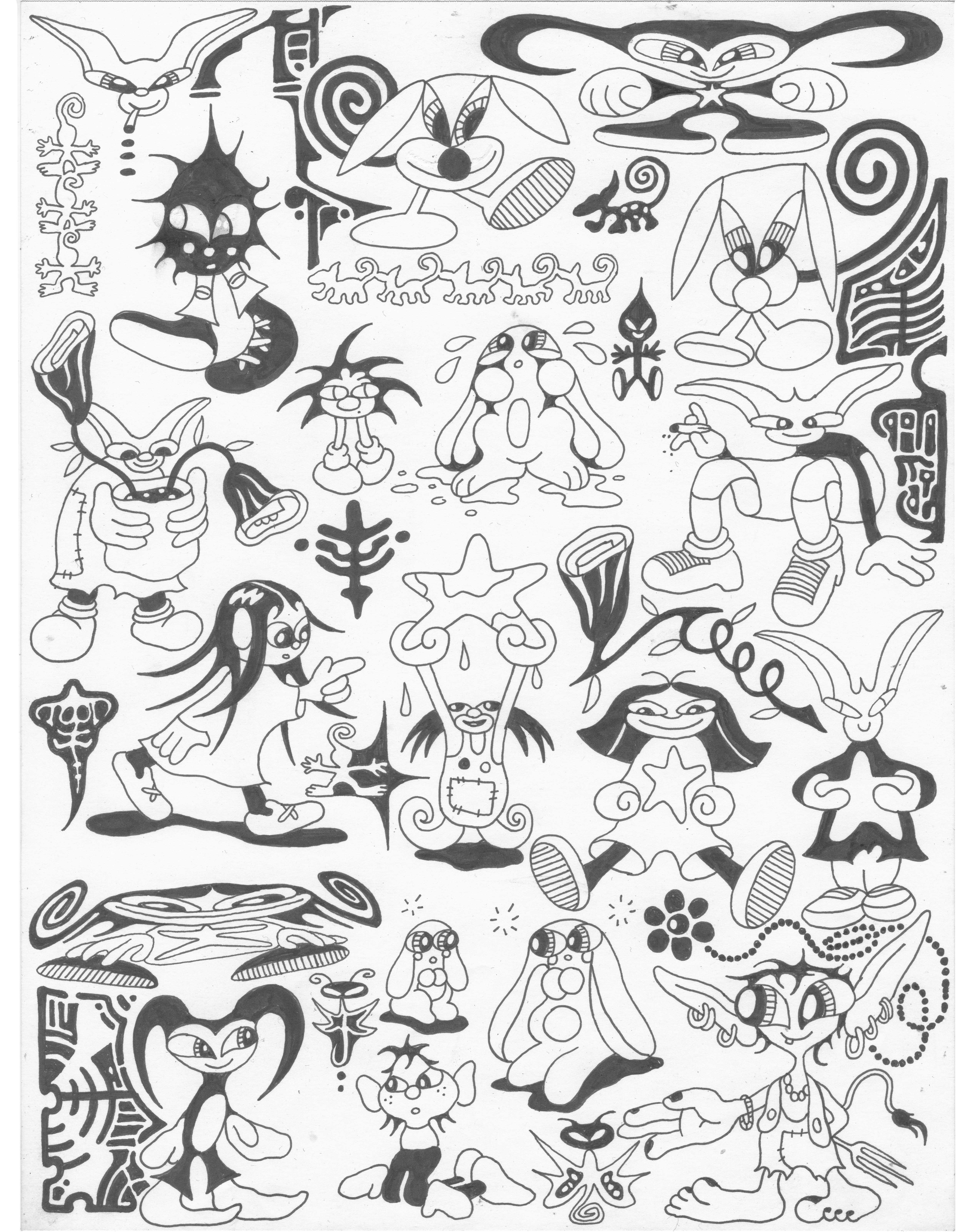 This one is the most doodley of all the April sheets. This was the first one I made for the month and I used it to pull characters for some of the other sheets. I actually drew like 3 other sheets this month but I really didn’t like them so I pulled from them as well to make some sheets I actually liked. Would be fun to do this cyber tribal kind of stuff freehanded between other tattoos. In color would be really cool too.